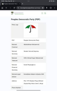 Screenshot of INEC website showing an update of PDP leadership.